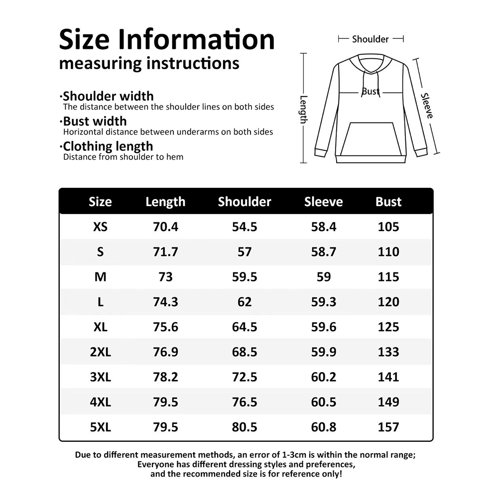 • Sizes: XS, S, M, L, XL, XXL, 3XL, 4XL, 5XL